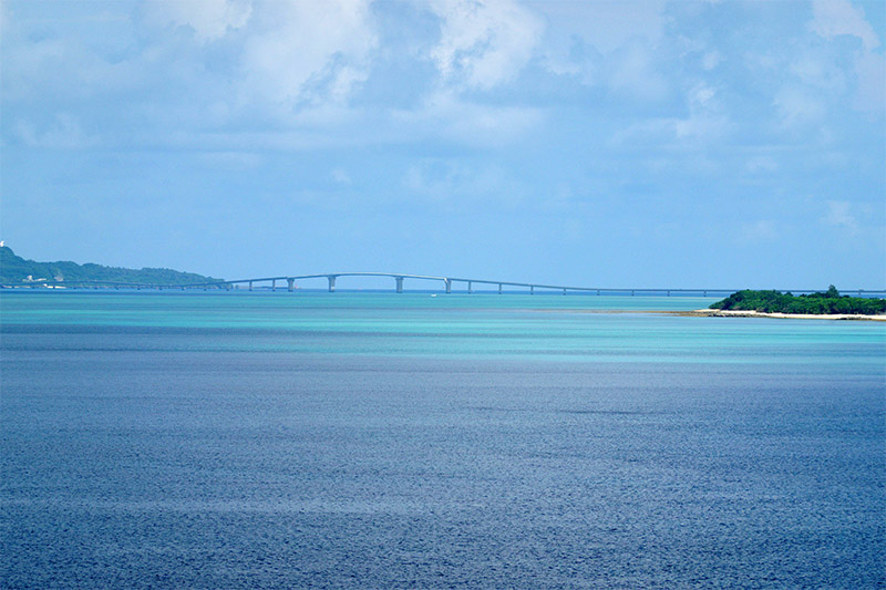 ■右に振ると、伊良部大橋。右端に見えるのは、朝歩いた与那覇北ビーチだね。