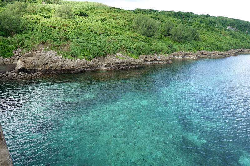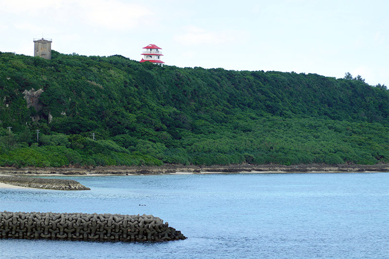 ■さて、向きを変えてこれから行く「来間島」を見てみる。基本、海に行くには「絶壁」を降りるしかなさそう。つまり島は台地形状な感じかな。赤い屋根の建物がいいアイコン。この後行くよ。