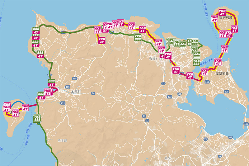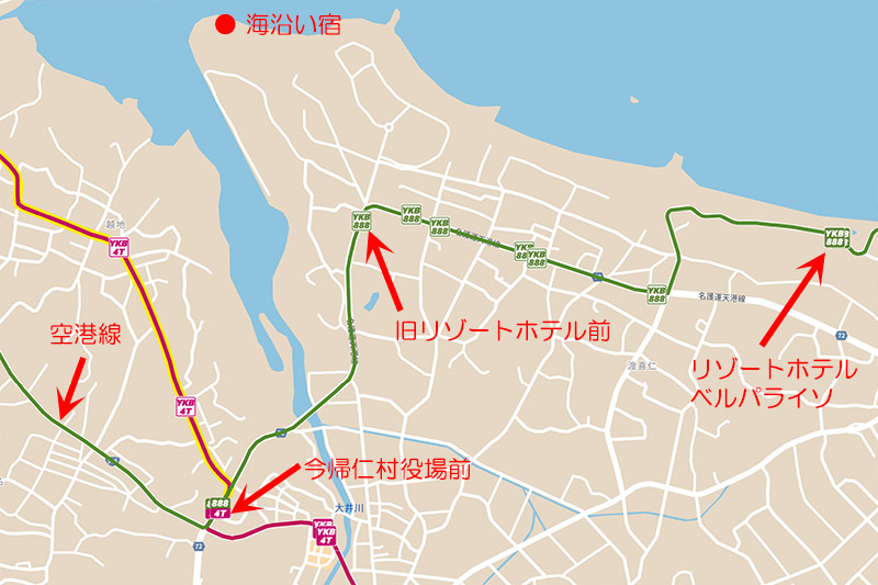 やんばる急行バスのサイト見ると、ホテル最近のバス停留所は「今帰仁役場前」停留所であって、そこからホテルまで2キロもある。でも、よくよく読みこんでみるとホテルにもっと近い「旧リゾートホテル前」というバス停があった。ここはホテルまであと1キロである。「なんだ、こっちがいいじゃん」と。