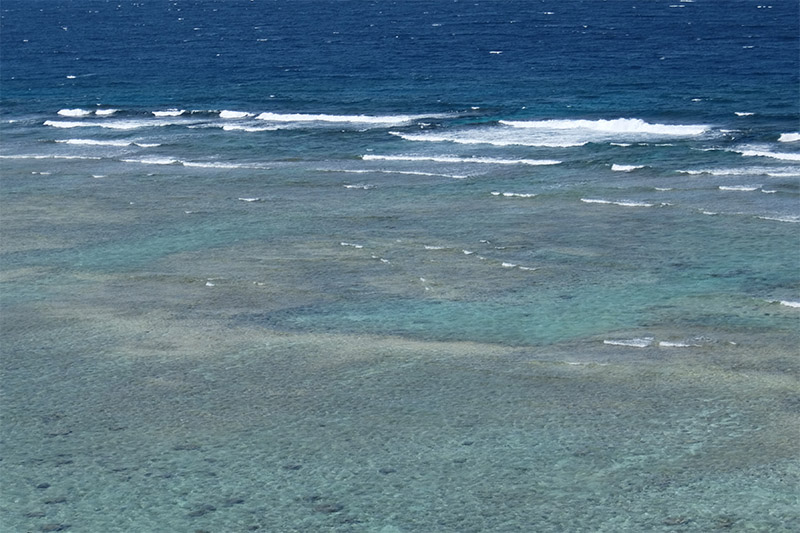 ■少し海側を見る。明らかに珊瑚礁が分かる。緑の木からは崖になっている。実はこのあとこのがけ下にも行ってみた。誰もいなくて怖かった・・・