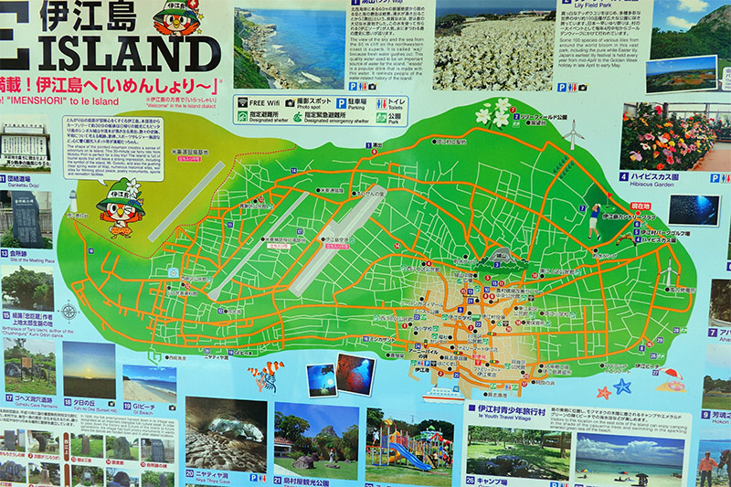 地図を見ると、滑走路が3本あったのがわかった。一番大きなの伊江空港。飛行機が飛んでいる形跡がない。1日に1本くらいなのかなぁ?と思っていたら、すでに閉鎖されていた。のは前に書いた通り。この時はそんなの知らない。知っていたら廃墟を見に行ったかも。