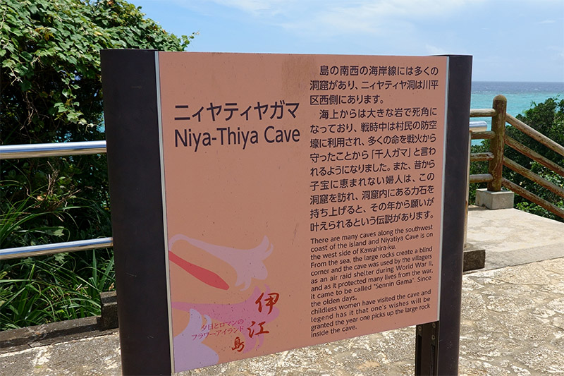 ■次なる名所「ニヤティヤガマ」に着いた。いつもの島マップがある。ここで注目は、米軍補助飛行場跡地ってのに「立ち入り可」って書いてあって、伊江島空港に「立ち入り不可」って書いてあること。よく読めばよかった・・・