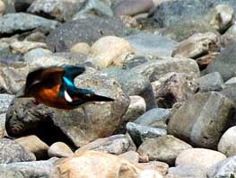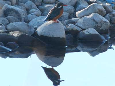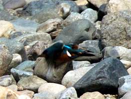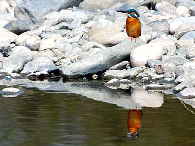 ◆でも念じていると川向こうの石に止まってくれました。石カワセミも好きなのです。ちゃんと水面に反射するしね。