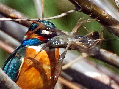 ◆カワセミがくちばしをゆっくり開けはじめたら「ペリット」を出す直前です。ほらのどから出てくるところが見えるでしょ。これあ赤いペリットなんで「ザリガニの成れの果て」ですね。