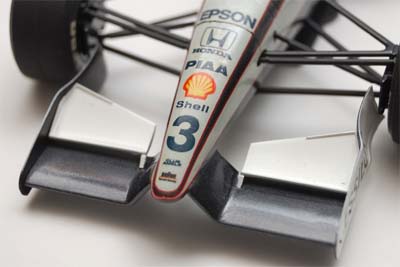 塗装・デカールのポイントはノーズからカウルエンドに渡る「白ライン」をどうするかであろう。塗装で仕上げるか、素直にデカールで貼るか。実はこの白ラインの上下端にすごく細い赤ラインがあったりするのである。これを塗装では仕上げられない。やるとすればデカールから細赤だけ切り離す作戦があるのだが、やけに面倒である。今回は素直にデカールで仕上げた。が、このデカールノーズ部分の曲率が実際のマシンと合わないのだ。完全なる設計ミスであろう。なのでマークソフターの大量塗布になってしまった。