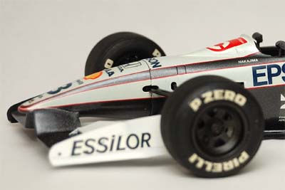 その90年のティレル大躍進と中嶋悟というホンダドライバーが相成って、91年ティレルはホンダV10エンジンをゲットしたのである。前年までの「スポンサーありませんよ」的なシンプルカラーリングから一転、BRAUNがタイトルスポンサーになって、カラーリングもダークグレーメタリックに大幅変身した。マシンの特徴はモノコックがすごく「ダル」になったことであろう。エンジン排気はアンダーパネル下ではなく、ボディー最後端のカウル内から直接出すものである。さて前年までの軽量コンパクトなマシンに対して、ホンダV10エンジンはあまりにも重かった。マシンの性格も大きく変わってしまった。結局前年のようなすばらしい成績を残すところなく1年が終わってしまったのであった。