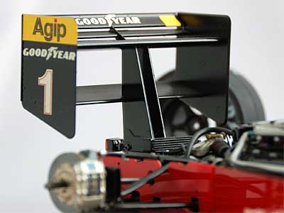 田宮の新生1/12シリーズ再開の第1作です。発売が90年12月ですから、その前のルノーRE20から10年間、1/12のリリースが無かったのですね。F1プラモ不遇の時代! でも昨今(2006年)はもっと不遇の時代かも。私としては1/12スケールでは、ロータス78に継ぐ2作目です。それなりに手を入れたつもりですが、今となってはとても恥ずかしい出来です。でも完成させなきゃただのプラスティックですから、それはそれでいいことなのです。ディスプレイ台にシーナリーストーン(微小小石)と灰色ペンキで路面を再現したつもりでしたが、いつまでたってもペンキ溶剤が揮発しているようで(そりゃあケースかぶせてるもん)、金属部分がぼろぼろに腐食していました。(T_T) それにエナメルカラーのゴールドは緑色に腐食しちゃってます。これってだめなんだ・・・