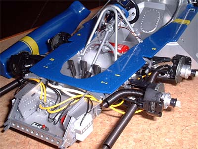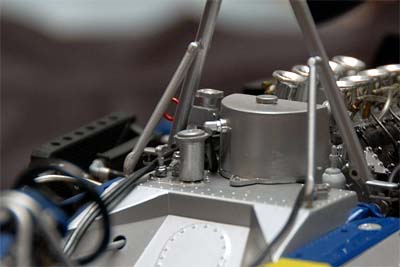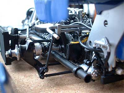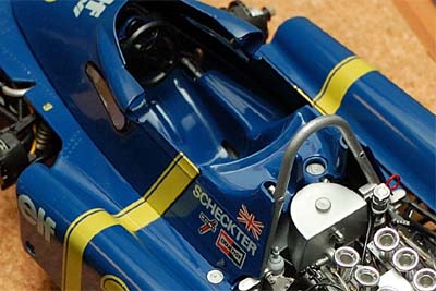 日本人にとってF1と言えばこのティレル(たいれる)を思い浮かべる人は多いでしょう。それほど有名なこの車は、フロントタイヤを空気抵抗を減らすために小型にしてスポーツカーノーズに隠しています。小径タイヤでのグリップ不足をタイヤの数を増やして補うといった設計思想です。模型を作って分かるのは、フロントステアリングの複雑なリンク構造です。こりゃ大変ですわ。
