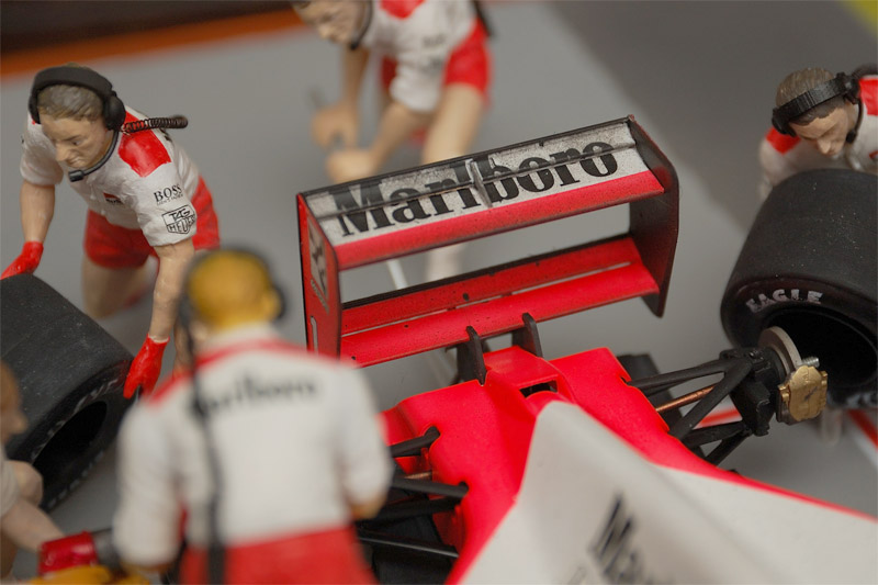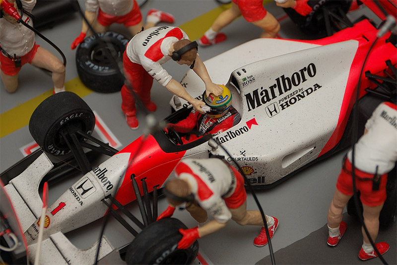結局作ったのは、91年はフジミMP4/6キットを生かした部品展開モデル、93年はセナとヘルメットをテーマに、そして92年は今回の展示のハイライトであるピットインタイヤ交換ジオラマにした。本当は90年のMP4/5Bで作りたかったんだけど、91年以降でそろえたいという「気」を感じ、自らMP4/7に決めたのだ。