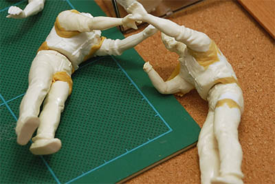 パテ盛りでポーズを作るのは結構楽しい。楽しいけど難しい。なぜかといえば、腕を上げたい場合、単に腕を上げるだけではだめなのだ。体も引っ張られるし腰の角度も変わる。つまり一つ動かすと全身が動かさないとバランスがとれない。ここはまだまだ修行を積まなければならないなぁ。さて各部位はエポキシパテでつなげる。案外乾燥が遅かったりして、自重で決めた角度が動いちゃったりするので要注意である。久しぶりにヨドバシにエポパテを買いに行ったら「速乾性」なんてのが売ってたんで使ってみたのだけど、ちょっと色が濃いので失敗だったかも。それほど速乾でもないし・・・