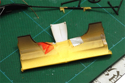 さて、いわゆるMarlboroシェブロンと呼ばれている逆三角赤。まずはマスキングの型紙を作成することから始めなくてはならない。タミヤのキットはデカール仕上げが標準であるけど、細い塗り分け凸がモールドされている。しかしこんなモールドは下地仕上げで簡単に消滅してしまうのでやっぱり型紙が必要だ。実はフジミのMP4/6には塗り分けのマスキング型紙がついていた。おお、これ使えるじゃんと思ったのも数分。折り曲がり部(後述)の位置が微妙に合わなくてすぐにただのゴミと化した。フジミよ、もっとまじめに作りたまえ。