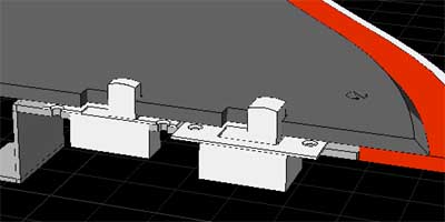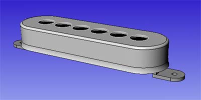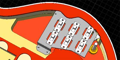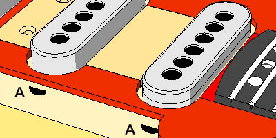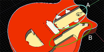 ご存知の通り、レッドスペシャルのPUはトライソニックである。しかしまだまだ知識の少ない私はトライソニックはひとつだけと思っていた。すなわち本物のレッドスペシャル(オールドレディー)にも、Burnsのレッドスペシャルにも形状的には同じ(図14)モノだと思っていた。しかしBurnsに搭載されていたトライソニックをCAD化してレッドスペシャルに載せてみると、取り付け耳の部分がボディーにもぐりこんでしまうことが分かった(図15-A部)。つまりPUのザグリが浅いのだ。本物はトライソニックVという話もあるのだが、形状が分からない。ケース横から耳が出ているのならぴったりなのであるが・・・