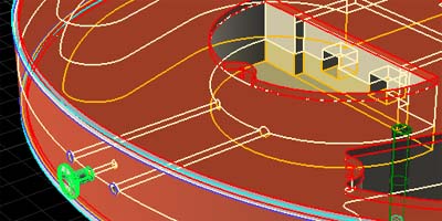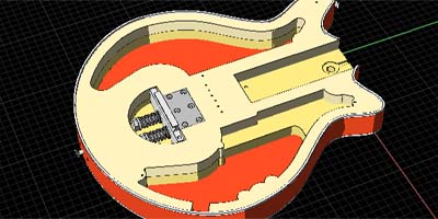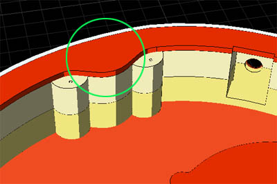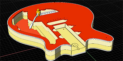 しかしスクリュー本数の少ないなりに、スクリュー固定場所には魔モノが潜んでいた。それは向かって右側のスクリュー(図11/E部)である。フライヤーさんのリペア写真で、ピックガードをはずし、ピュアボディーだけになったレッドスペシャルがある。同じ角度からのCAD画を図11に示しておこう。ここで特徴的なボディーの出っ張りをみつけた(図13丸部)。図8からも分かるように、それはスイッチプレートの保持場所と、ピックガード締結スクリュー用の「島」である。