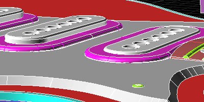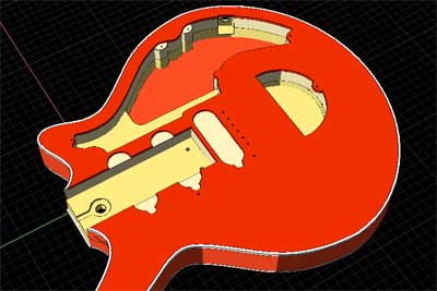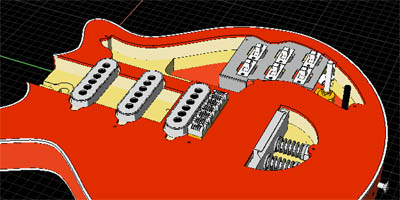 ちなみにオールドレディーの場合はPUはボディーに直付けされている。そのためPUの高さ関係がボディーとネックの形状で決まってくるのだ。高さ(厚み)関係は今回のモデリングで最も苦手とするところである。ピックガードの厚みが3mm、PUサラウンディングの厚みが2mmとすれば、各PUがPUサラウンディングからどれだけ頭を出しているか?ということで高さ関係を推定することができる。見たところフロントPU側でPUの出っ張りが1mmくらいか?