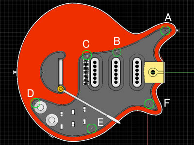 と推測するのは、極めて自然であろう。しかしこれがトラップであった。レッドスペシャルの画像から見ると図11/E部のスクリューはリアPUより少しだけ下のライン上に位置するのが分かる。しかしだ、図13の丸部はどうみてもブリッジより下のラインなのである。これは悩んだ。そしてレッドスペシャルの国内最大BBSで質問をしてみた。すると「スイッチプレートに孔がありそこに留めている」との教えを受けた。いいねBBS。ということで、位置は分かったが、なぜこの島があるのか?はいまだに謎である。唯一考えられるのは、ブライアンがピックガードの孔を開けるときに、本当はこの島の部分に開けるはずだったのを間違えてしまった、という説である。こればかりはブライアンに聞かないと分からないだろう。