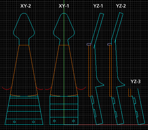 ナットからヘッドくびれにかけての形状(図1-B部)も分からない。まあここは短い部位なので体制に影響ないから「どうでもいいじゃん?」かもしれない。が、CAD化の時にはこういうところまで決めないと絵がかけないので、重箱の隅状態に陥ってしまうのだ。さて上記ネックポケットとは逆でXY-1のようにネックのアウトラインそのままでヘッドのくびれまで行くのではないか?と思っている。XY-2のようにナット部で折るのは面倒だからである。