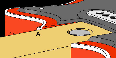 ちなみに少ないとはいえネックは2度の角度がついているわけである。2度なんて誤差に思えるが、YZ-1のような構造だと、フィンガーボードは19フレット付近のボディーとの勘合部位(図7-A部)まではちょびっと埋まってしまうのである。ちなみにA部では約2mmくらい埋まる。結構見逃せない。さらに図8で3mmのピックガードを載せてみると、フレットボードはほとんど埋まってしまう。2度っていう角度は小さく感じるが、思ったよりも影響が大きく及ぶ数値だ。最近は2度と言う数値に多少の疑惑を持ち始めている・・・ なんとなくフレットボードがもっと厚いか、ネック-フレット接合面がもっと高い位置のような気がする・・・