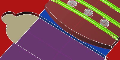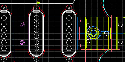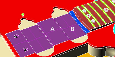 これらの疑問は楽器屋でブライアンメイ本を立ち読みしたときに解決した。まさにフィンガーボード端の拡大写真があったのだ。それを見るとYZ-1の形状だということが分かる。が、喜び勇んで家に帰り、PCを立ち上げ図面を書き始めたときに「あれ?」となった。ネック端がPUザグリの端とドンピシャにして絵を描くと、フライヤーさんのレストア写真とちょっと違う感じになる。真正面から撮ったピックガードをはずした写真をみると、ネックポケット部のザグリ形状はザグリ/グルーブ部(図5-A部)と基準面/ランド(図5-B)のY方向の間隔が等間隔に見えるのである。PUの位置は決まっているので、ザグリを広く取るとこのランド-グルーブの関係がちょっと崩れてくる。さらにPUネジ止め(耳)逃げもザグリを広く取ると写真との形状とは違ってきてしまう。ここはとりあえず下のように書いておく。