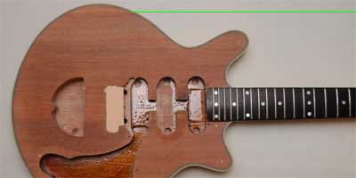 ピックガードをはずしたときに見えたザグリ部分から、トップ材は5mmであることが分かっていた。実際トリマでトレモロユニット部分のポケットをザグった時に、写真1のようにメインコアと接着されているトップ材がはじき飛んだことからもそれが分かるのだ。ちなみにこの接合面がボディーサイドから見えないように、バインダーは深さ方向をトップ材と同じ厚み(5mm)にしているようだ。