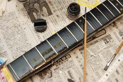 筆で塗ることにした。まず塗料として模型用塗料(クレオスラッカー)しか所有していなかったから。でも同じ模型用塗料でも普通はハンドピースで吹いた方がいいに決まっている。でも筆で塗った。なぜかといえば、”フレットのマスキング”をしたくなかったからだ。こういう些細な理由は後々”急がば回れ”を痛切に感じざるを得ない結果を得るのだ。