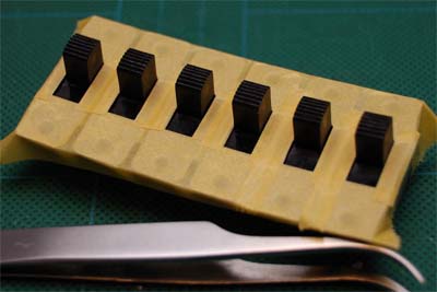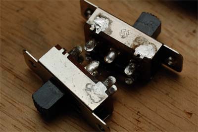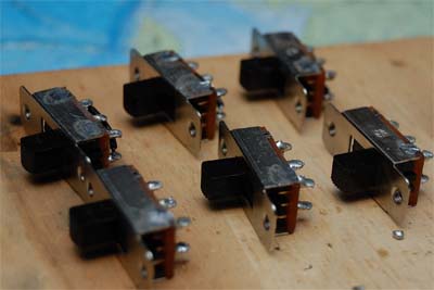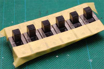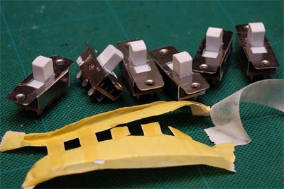 白を塗るためにマスキングである。まとめて塗装したほうが効率がよいのでひとまとめにするのだ。そしてスライドSWは「スライド」するSWなので、両スライド方向で塗装しておかないと白黒スイッチになってしまうのだ。なので、塗装はちと面倒である。