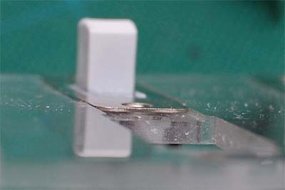 ブリッジのローラーピン受け部は幅1mmである。つまりピン径も1mm。一方弦のテールエンド金属環、過去乱買いしたギターについていた弦のエンド部だけ収拾していたが、ひとつだけいい感じのセットがあった。環の内径が2mmのものだ。つまり内径にあう田宮2mm丸棒をカットし、金属環に埋め込み、そこにピンバイスで1mmの孔をあけ、ピンを通すと言うものである。
