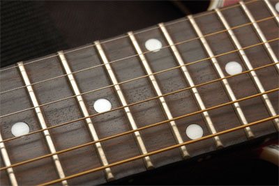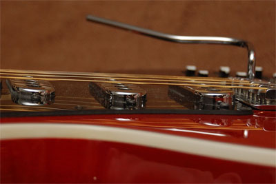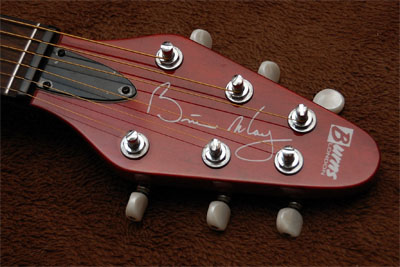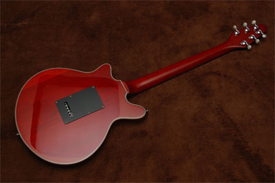 そして最大の改造が施されてあったのは指板である。都内有名リペアショップでRをゆるくしていた。合わせてフレット打ち直し。これは引きやすくするため、と言われていたが、通常Burns Red Specialのありえないほどのブッ太いネックが良かったので、ちょっと残念だった。でも指板を削った以上にネックが薄いようである。プロトタイプはこうだったのか・・・