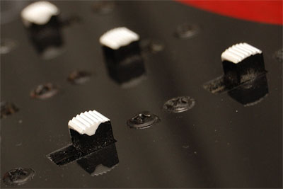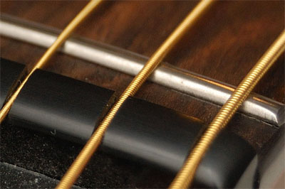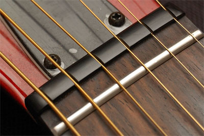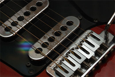 白く見えたSWはトップ部だけがマーカーで白く塗られていただけだった。弦はブライアンご用達のオプティマである。ゴールドカラーが印象的だ。ペグはシャラータイプ(白のパール系)にリプレースされている。VOLノブはたぶんKzのものアルミヒキモノにリプレース。ストリングスガイド(0フレットがあるので、ナットじゃないのだ)は結構ちゃんとしたものにリプレース。カラーは冒頭で書いたように、ものすごく暗いレッドから明るいレッドになっていた。試作品はこのカラーだったのか?こっちのほうが断然いいぞ。