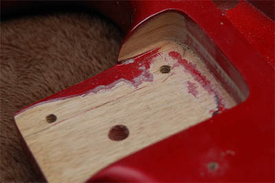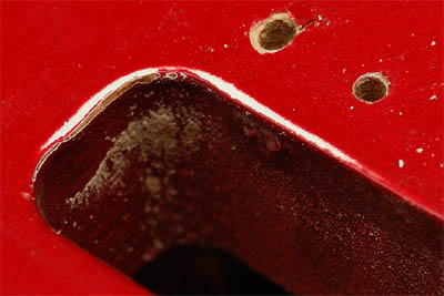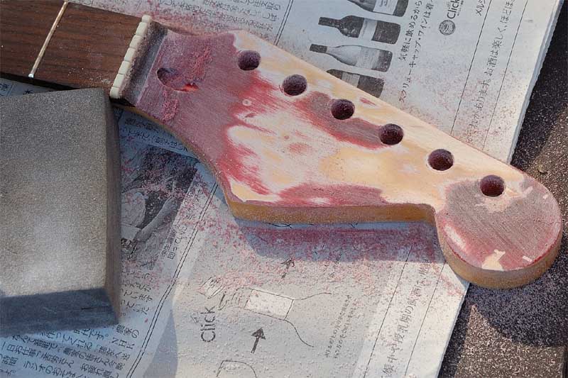 黄色とか赤とかをちゃんとした色にしようと思ったら、下地を白とかピンクとかで作っておかないと泣きを見る。黒ギターばっか買ってばらしているので色つきギターのことは分からないが、このギター、ちゃんと下地が白である。なんだか基本に忠実にしっかりコストかけているぞ。ちなみに淡いカラーのZO-3は下地カラー処理なしであった。隠蔽力が高い塗料なのかな?