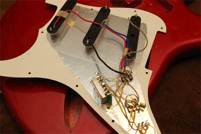 今までの安物ギター、ピックガードの裏を見ると、ボリュームとかトーンとかのポッド周辺だけ、プレイメイトよろしく最小限のシールドをしているのであった。しかしこのギターは惜しげもなくPU部分にまでシールドをしている。いいぞいいぞ、Photogenic!