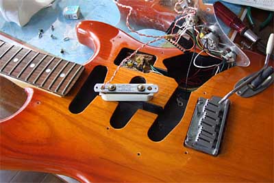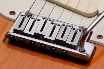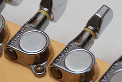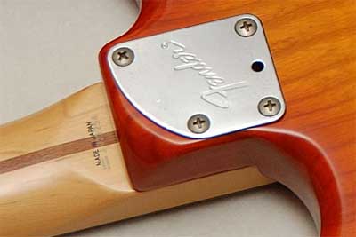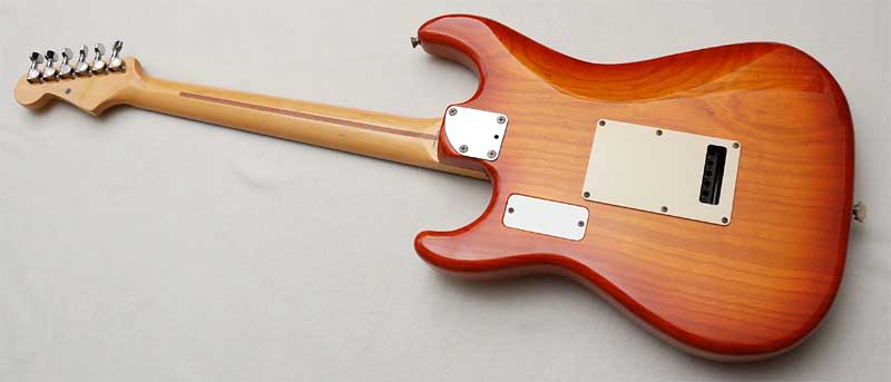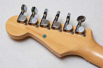 このオレンジっぽいサンバーストがかっこよくてしょうがない。さらにリアのブリッジ駒が従来の板金ものからアルミダイキャストに進化している。PUもマグネットピースがカバーで隠れているレースセンサーってのも、新世代のストラトっぽくてかっこいい。5ポジションスイッチなので、いわゆるハーフトーンが出せる。歪ませないか軽く歪ませたくらいだと、ハーフトーンが美しいぞ。ジェフ・ベックのシーズ・ア・ウーマンあたりを弾くとうれしくなる。