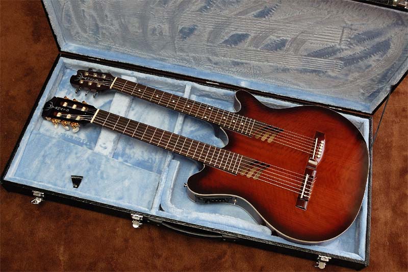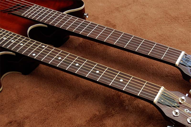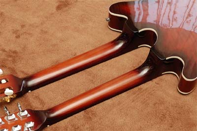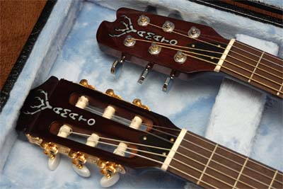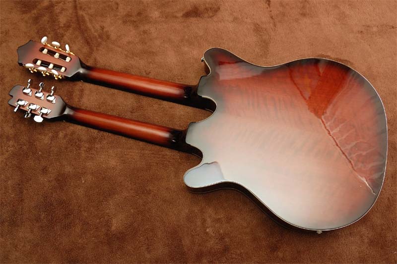 実はこのギターにたどり着いたのは、「12弦」で検索をかけたときであった。12弦と6弦のダブルネックアコースティックが引っかかったのだった。しかしよくよく考えてみると、12弦と6弦のダブルネックって微妙に意味なさそうである。12弦はそのほとんどがストロークで弾かれる楽器というイメージがある(実は我が師匠ブライアン・メイ先生は、ライブで弾くアコギは12弦でフィンガーピックしているけど・・・)。とうことで、イジイジしていたら、なんと、ガットとスチールの両6弦ダブルネックアコースティックが出品されているではないか。これだ、コレだよ。と勢い飛びつきたかったが、実はガットがしたでスチールが上という、「逆じゃない?」と思える仕様で踏みとどまった。しかししばらくたつとガットが上でスチールが下という、「コレだ!」仕様が出てきた。でも色が黄色っぽくてちょっと嫌だ。どうやら他にブラックとシースルーブラウンがあるのだ。そのどちらかが出品されたら入札しよう、と思っていたら、ブラウン品が出品された。
