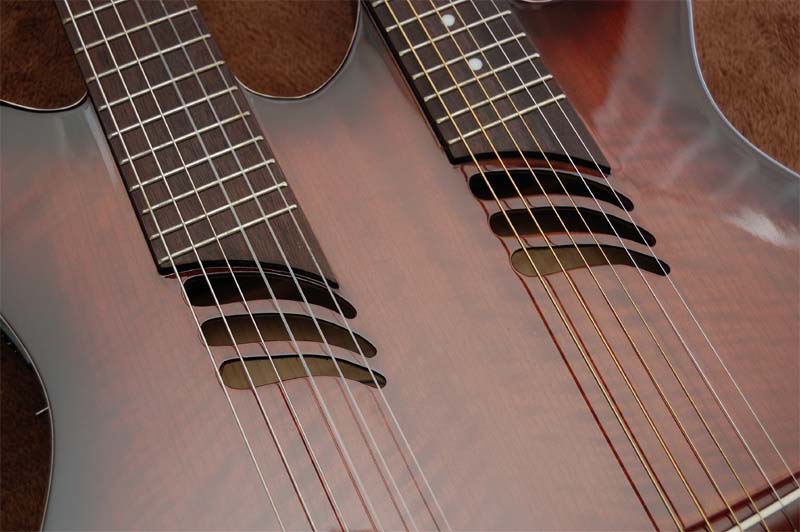 そしてそのギターとは一部で「謎のギター」とうわさされる「大和ヒューマンギター」という会社が作っているギターである。この会社のポリシーは「安くてかっこいいギターを供給する」という方針らしい。確かに普通じゃないギターばっかりだ。エレキギターもたくさんあるのだが、今回はアコースティックに心を動かされた。まず超豪華なインレイが施されたシリーズに食指が動いたが、それはあくまで6弦アコースティックギターであって、それならば家にたくさんある。やっぱりこんなの触ったこと無かったぜというものが欲しい。それがダブルネックアコースティックギターであった。