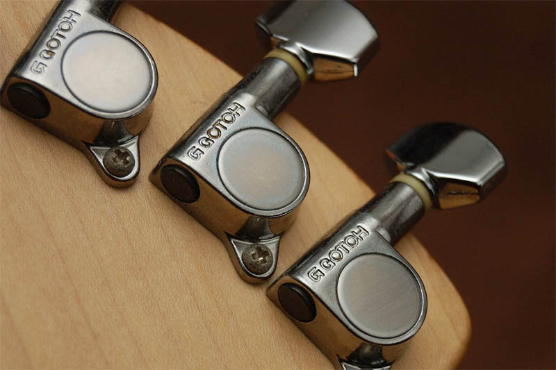 さてパーツを見てみよう。まず CゼブラカラーのハムバッキングPUが目新しい。そしてDゴトー製のペグがついていた。これは所有者が付け替えたのかもしれない(その理由は後述する)。さらに今までに購入したZO-3の半分で壊れていた E電池ボックスふたも正常であった。