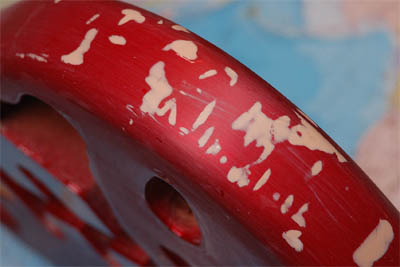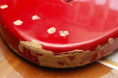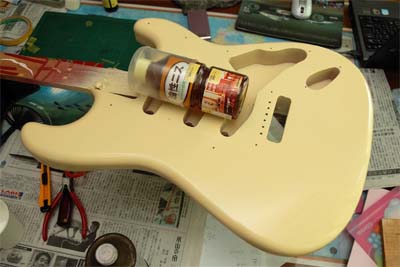 さてこのクリームホワイト。以前コーナンで198円で買ったクリームホワイトである。あるものに使って「ちょっと嫌だ」と思っていた色なのだが、このギターには最高なのであった。すごくいい。しかしクリームホワイトを吹いた後、ラッカーのクリアを拭くのもいいのだが、塗膜が劇弱なのがいやなので、実験的にウレタンラッカーを筆塗りしてみた。しかしウレタンの筆塗りはやっぱりサイドの「たれ」が激しく、断念。はがすのが大変だったが、結局クリームホワイトのみの塗装とした。しかし普通じゃないということで、吹いた後ペーパーをかけてマット処理としてみた。これが案外「いいかんじ」なのである。