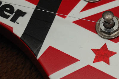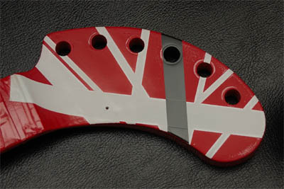 で、はめてみたら「あれ〜〜〜〜〜〜〜〜」と叫ぶ羽目になった。スピーカーエスカッションに黒入れるの忘れた! それにジャックプレートは白くしなければならないところのマスキングを忘れて、赤になってしまった! なんだかこの5150モデルはいろいろ大変なモデルである。