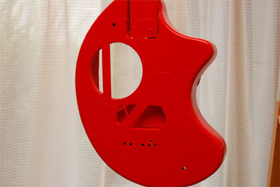 さて赤塗装。いつもと同じ勢いでプシューとやる。ネックのところでも書いたが、ここはコーナンの赤スプレーとした。朱が強い黄色側に振れている色だ。