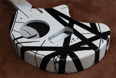 黒にマスキングをして白を吹くことで、黒のストライブができる。さて今回はボディー形状が全く違うギターをフランケンっぽくするわけである。なので、センスが必要なのだ。どうだろう?私にそのセンスがあるのか?とりあえずマスキングの写真を以下の載せるが、センスあるかなぁ?