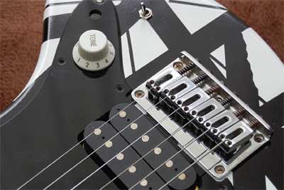 PUはエスカッションを用いて吊られていたのを、エディー仕様のボディーダイレクトマウント&ちょっと傾けをする。となると、また木片をスペーサーにした取り付け法になる。木にタッピングするときはちゃんと下孔を開けておこう。