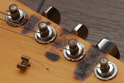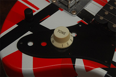 フランケンのいくつもある特徴の中で結構マニアックなのが「たばこの焼け跡」である。ストラト系のスモーカーはよく吸いかけのたばこをヘッドの弦とのすき間に挟み込むが、エディーもまさにそれである。タバコがへっと側まで焼けると、当然ヘッドが焼けるのだ。