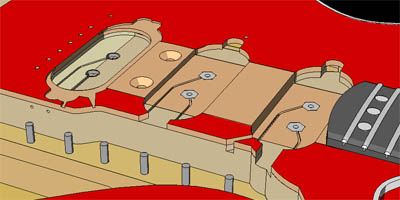 前回構造を推測したとき、トレモロチャンバーは開口形状(半月状)のままで座ぐっていると思ったので、アクセスホールが超長くなる ⇒ アッパー/ロアのボディーにあらかじめアクセスホールとしての溝を切っておく・・・と考えた。しかしトレモロチャンバー内部が開口部より大きいのなら、ほんの短い孔をあけるだけでスクリュー頭にたどり着く。そしてボディーを完成させた後でアクセスホールを開けることが可能である。多分そうしただろう。