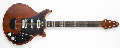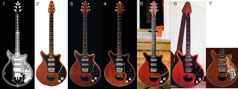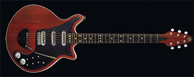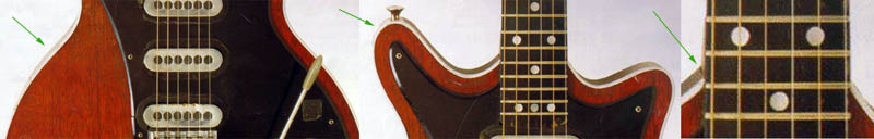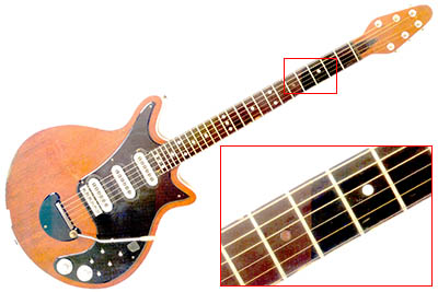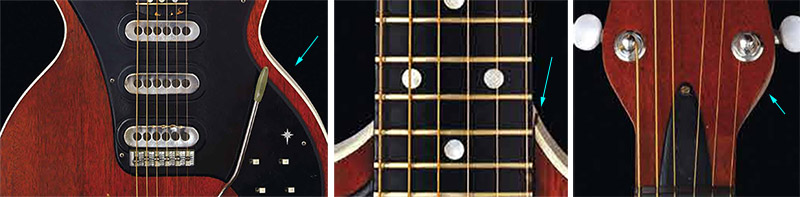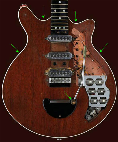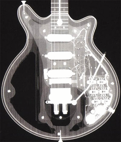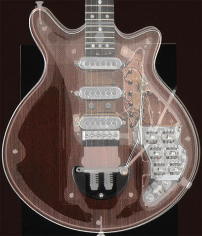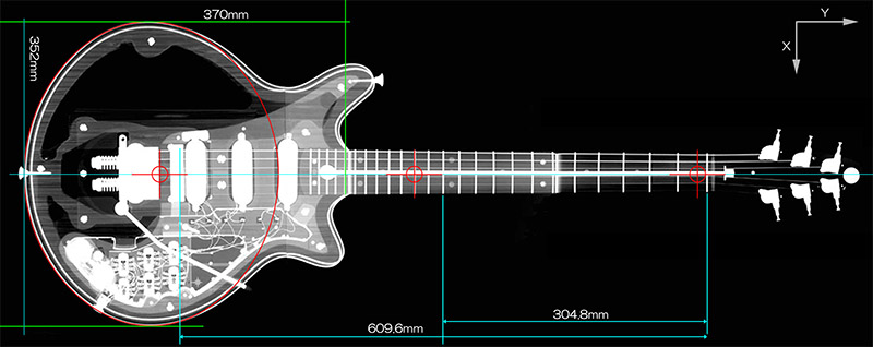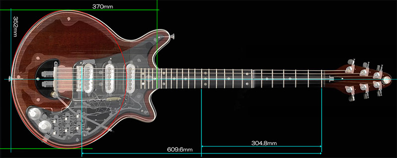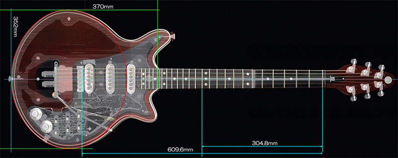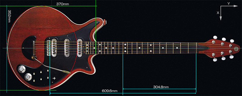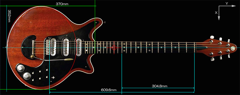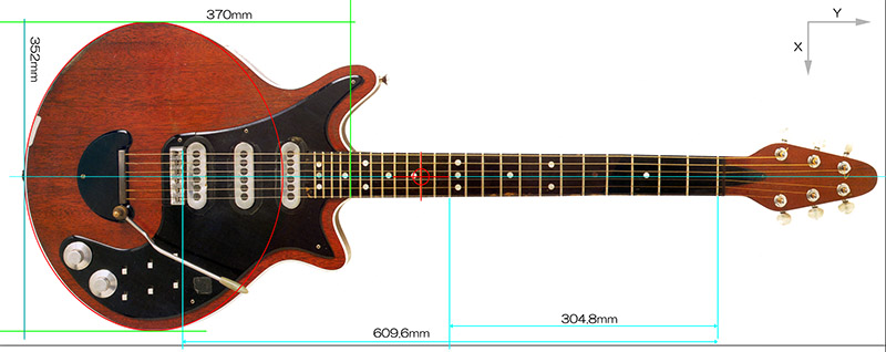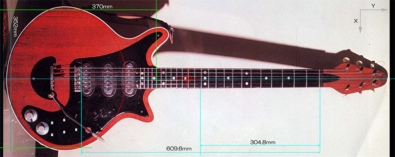 この写真は長く私のレッドスペシャル(当時はそんな名前付いていなかったよなぁ?)の標準画像であった。ネットなんてない時代なんで、「ブライアンメイのオリジナルギター」を正面からきちんと撮影した貴重な写真だった。なので私の中のレスぺシェイプはこれが刷り込まれている。しかし基準線を見てわかる通り、Y軸基準でだいぶ傾いている。ギターを壁に立てかけて真正面から撮るとこんな感じになる。なので、ボディーがヘッドに対してだいぶ前に出てきているのだ。つまりボディーがボリューミーに見える。逆に言えばヘッドが小さく見えるのだ。上のギターマガジンとは違い、ボディー幅方向もきちんと膨らんでいるので、投射図的にもあっている。唯一一点を除いて。