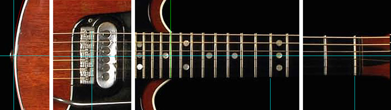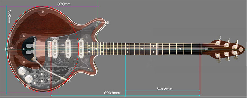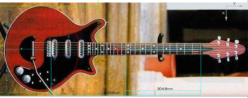 当然ながらこれらの写真も微妙にずれがあって、どれを信じてよいのかが非常に悩ましい。しかし絶対値的に信用できるのがネックスケールである。レッドスペシャルは24インチ(609mm)スケールと言われており、それを基準とすることにした。しかしスケールサイズで画像を合わせても、ボディーのサイズが違っていたり、ボディーの片側だけあっていなかったり、まあ眠れなくなるほど悩ましい写真群なのである。これが解析に気合が入らない理由であった。