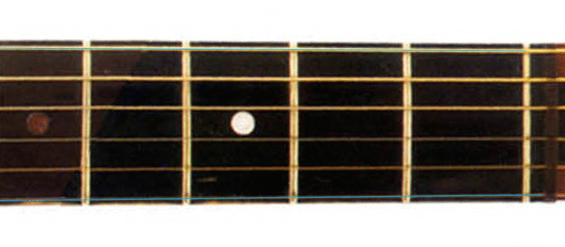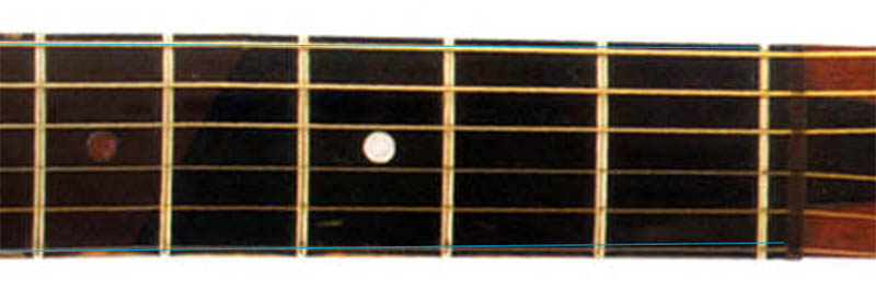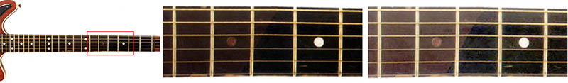 その唯一一点。ボディーがあれほど膨らんで写っているということは、相当斜度がついて撮影している。しかし20フレットを起点にしてボディーエンド側の拡大に比べ、20-0フレット側がほとんど変化がないことはおかしい。もっと短くなっているべきである。これも「なぞ解き」として残しておこう。