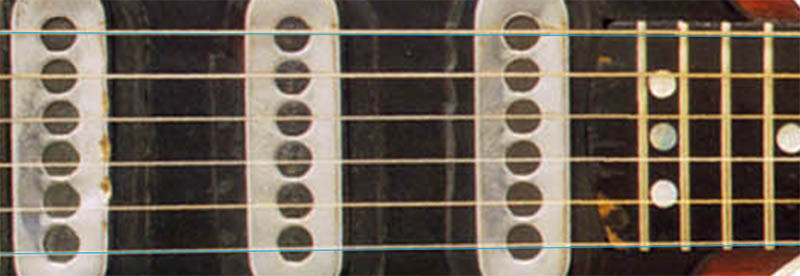 海外ギターマガジンにレッドスペシャル特集されたときの写真らしい。案外正面から撮影されたものってないのだ。0-12-20フレットの間隔がほぼ合うことからX軸中心の傾きが無いように見えるが、ボディーのふくらみが大きいのが何となく納得できない。それも幅方向はリアル寸法に近いがテールエンドだけが伸びている感じ。これをどう解釈すればよいのか?私にはその知見が無い。なので、参考写真として載せるだけね。