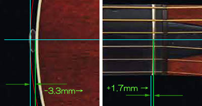 この写真から推定できることは、3次投射(撮影)になっていることだ。オールドレディーなんて普通触ることのできない国宝級のギターを撮影する機会を与えられたにもかかわらず、きちんと垂直を出さない撮影なんて恥ずかしすぎるぞ(怒)。撮影中心は12フレット近辺だと思う。X軸を中心にヘッドが近づく側、Y軸を中心にボディー1-3弦側(向かって右側)が近づく方向に傾いていると見える。
