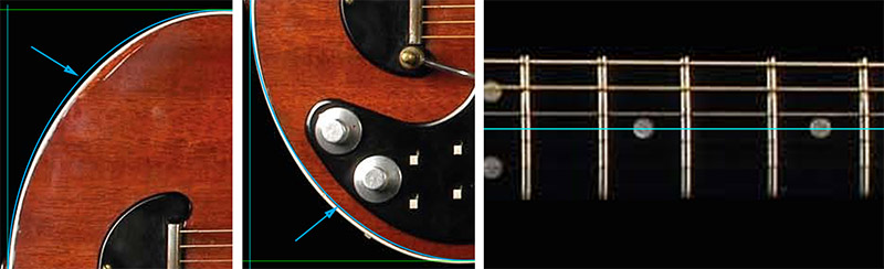 この写真実に悩ましい。X軸を中心軸とした傾きはゼロっぽく(カメラ撮影中心線とレスぺ垂線が平行)、ボディーY軸方向のスケールはばっちりなのである。下の写真には基準線あたりを抜き出してみた。すべての部位が理想基準とぴったり重なっている。