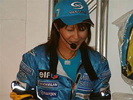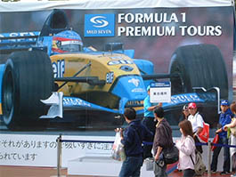 グランプリ期間中はいろいろなイベントが催される。そして俺はF1にくると毎回立ち寄っちゃうのがJT(マイルドセブン)のイベントブースなのだ。ステッカーやらなんやらをもらえる、っていうのがその列に並んだりしちゃう最大の理由だったりするのは内緒だぞ。しかしこのJT、今年は少し趣向を変えチケット配布による密室ブースへの招待なるものをやっていた。う〜ん、密室って妖しい響き・・・ だからその場で入場って訳ではないのだ。めんどくさいので金曜・土曜とパスしていたのだが、決勝の朝ブースへのチケット配布の列も微妙に短かった。で、並んだ。約1時間後に入場だ。なので一度グランドスタンドで各チームのガレージオープンを見て、それから戻っていった。でも時間通りに行ってもやっぱり待つんだよね。