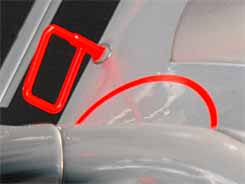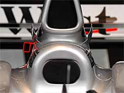 | なんか遠近感が強調されていいかんじである | 上のミラーで反射した絵。サイドポンツーン両脇に煙突排気口が見える | メルセデス系無彩色のなかで赤は目立つポイントだ。これはキルスイッチで一発でエンジンを止めるもの |