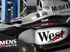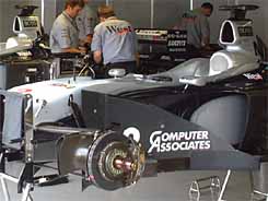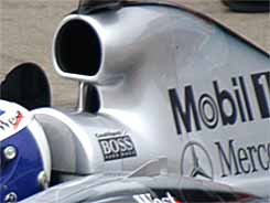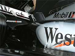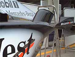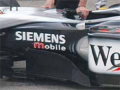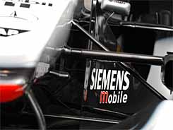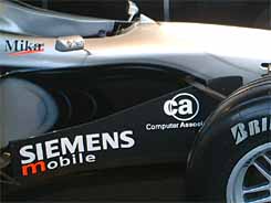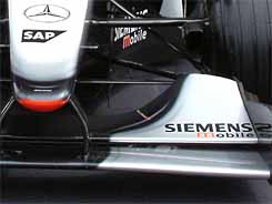 | これが今年(2003年)のマシン(MP4/17D)。バージボードは小型化されて、かつSIEMENSのロゴはモノコックに貼られている | さらに展示車のモノコック前端両脇にある”ヒレ”。左の今期マシンを見ても無いのだな | これも先ほどと同じ2000年のガレージにて撮ったもの。当然カーナンバーが違うがヒレは全く同じ |